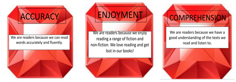 Our goal for Reading education is for children to read fluently, both for enjoyment and information, enabling them to access all future learning, to develop essential life skills and to nurture a love of reading, through the gems (big ideas):