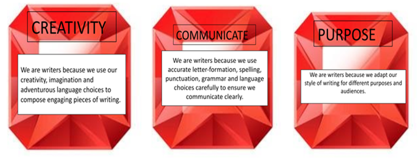 Our goal in teaching writing is for our pupils to know that the purpose of writing is to communicate with others, be creative and to interest the reader. Writing is taught and developed through our gems (big ideas):